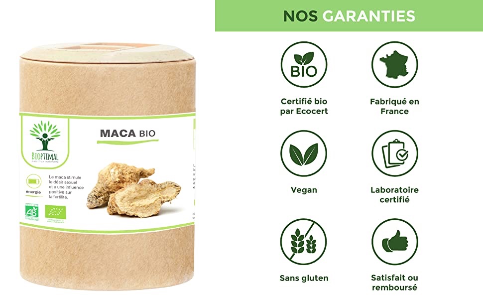 QUALITÉ FRANÇAISE = SECURITÉ : Nous fabriquons nos compléments alimentaires en France, nous avons fait le choix d’encapsuler notre maca bio en gélules végétales et non en comprimés pour ne pas intégrer de substances controversées tel que le stearate de magnésium ou le talc. Nos produits sont garantis sans additifs, ni ogm, ni pesticides, ni gluten, ils sont contrôlés en France et certifiés agriculture biologique, HACCP+ et Afnor