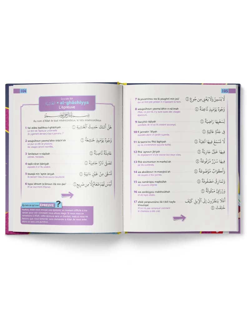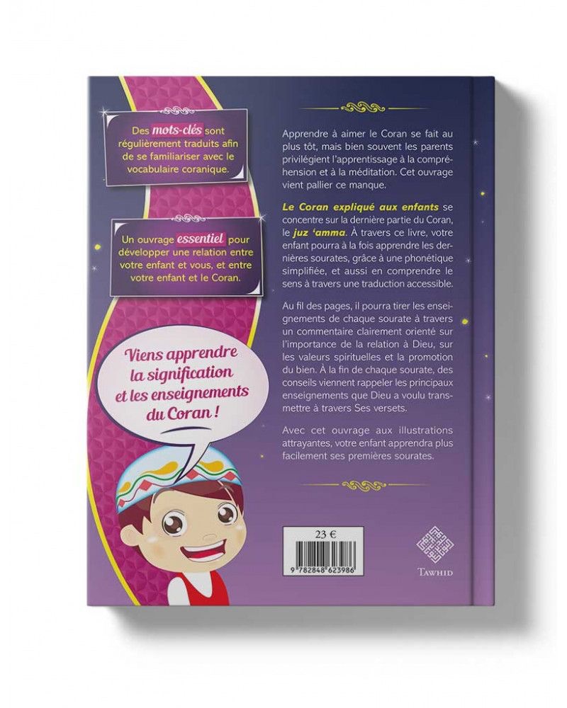 Apprendre à aimer le Coran se fait au plus tôt, mais bien souvent les parents privilégient l’apprentissage à la compréhension et à la méditation. Cet ouvrage vient pallier ce manque. Le Coran expliqué aux enfants se concentre sur la dernière partie du Coran, le juz ‘amma. A travers ce livre, votre enfant pourra à la fois apprendre les dernières sourates, grâce à une phonétique simplifiée, et aussi en comprendre le sens à travers une traduction accessible.