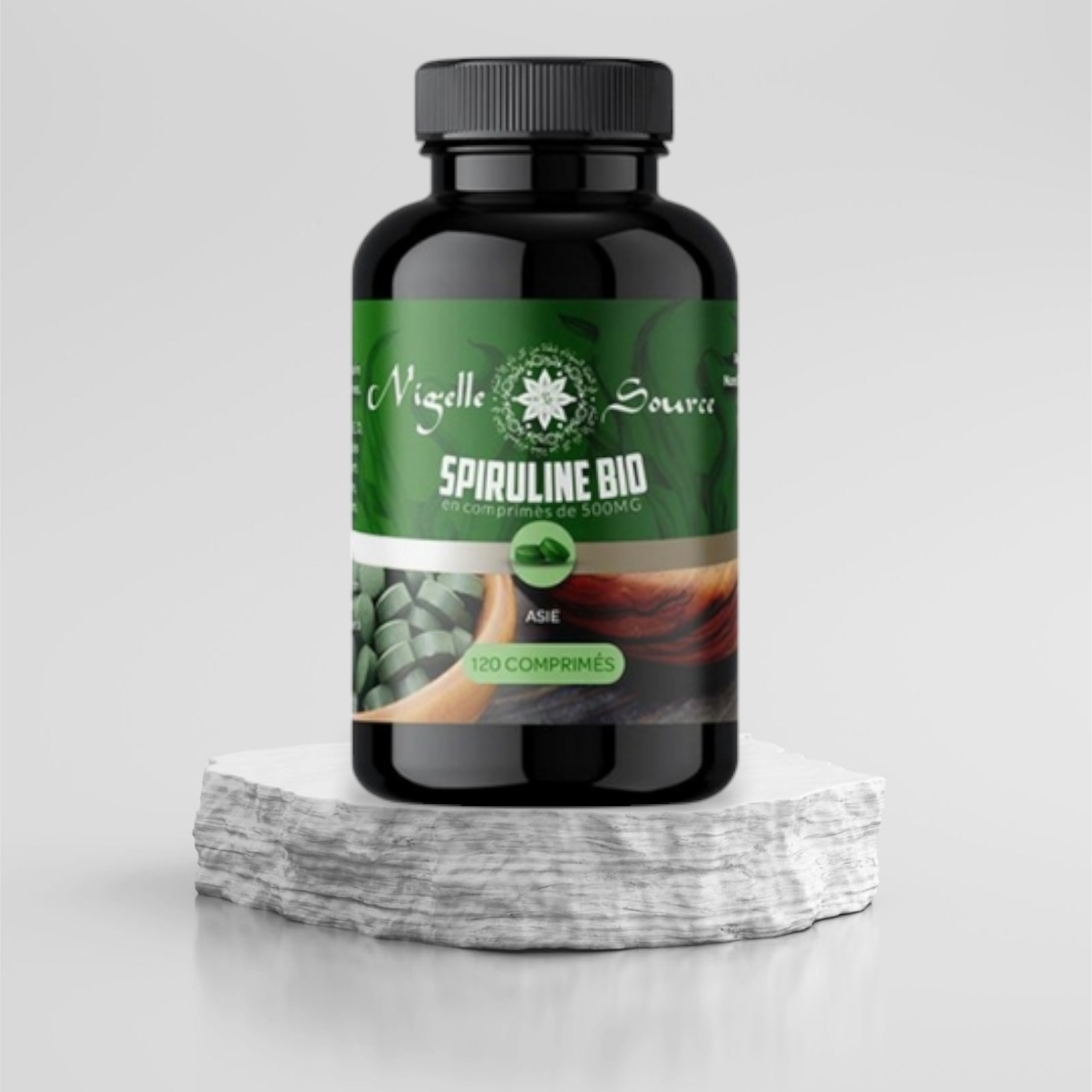 La Spiruline est un complément alimentaire qui contient en moyenne 60% de protéines. Elle contient également des vitamines A, E, D, B1, B2 B3 B6 B8, K du bêta-carotène, des minéraux et de oligo-éléments (calcium, phosphore, magnésium, fer, zinc, cuivre, manganèse, chrome, sodium, potassium, sélénium). Très riche en chlorophylle et ne phycocyanine qui sont des pigments qu’on retrouve aussi dans les végétaux. Ces derniers, par leurs propriétés, vont donner à la spiruline une couleur bleu-vert. Posologie : 2 à 6 comprimés par jour Nom Botanique : Arthrospira Platensis